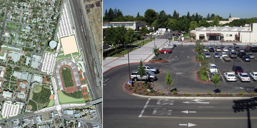 Wood Rodgers provided comprehensive engineering and landscape architecture services for this major reconfiguration of the campus circulation and parking system. The on-campus work included the creation of plazas and pedestrian oriented corridors, design of several parking lots providing a total of 600 parking stalls, correction of existing ADA deficiencies within the limits of work, lighting, and circulation improvements for pedestrians and vehicles, modifications to a light rail station, and new tennis courts. Offsite work included the major modification of two existing intersections, involving the reconstruction of an existing hook-ramp type intersection into a signalized four way intersection at the main campus entrance.