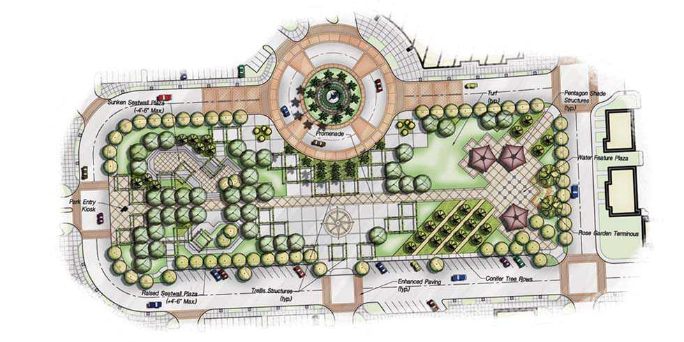 Commerce Station is a 150-acre mixed-use development, for which a five-acre urban plaza/park site was envisioned. Named Commerce Station Plaza Park, it is conceived as a passive space that will be a central gathering place and focal point. Providing refuge from the intense summer heat in an urban plaza dominated by hardscape was the primary challenge. To address this, a dense copse of broad crowned trees in tree wells and shade/trellis structures were carefully located. In addition, minimized turf, low water use plantings, heat islands reduction, and maximization of clear site visibility for public safety were goals that were addressed in the design.